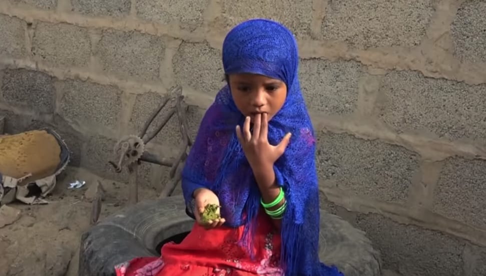 لا يجد اليمنيون في إحدى قرى مديرية أسلم أكثر من أوراق الشجر ليصنعوا منه عجينة خضراء حامضة الطعم يتغذون منها ويطعمون أولادهم في ظل الصعوبات التي تمنع وصول المساعدات الغذائية إلى تلك المنطقة الجبلية النائية.