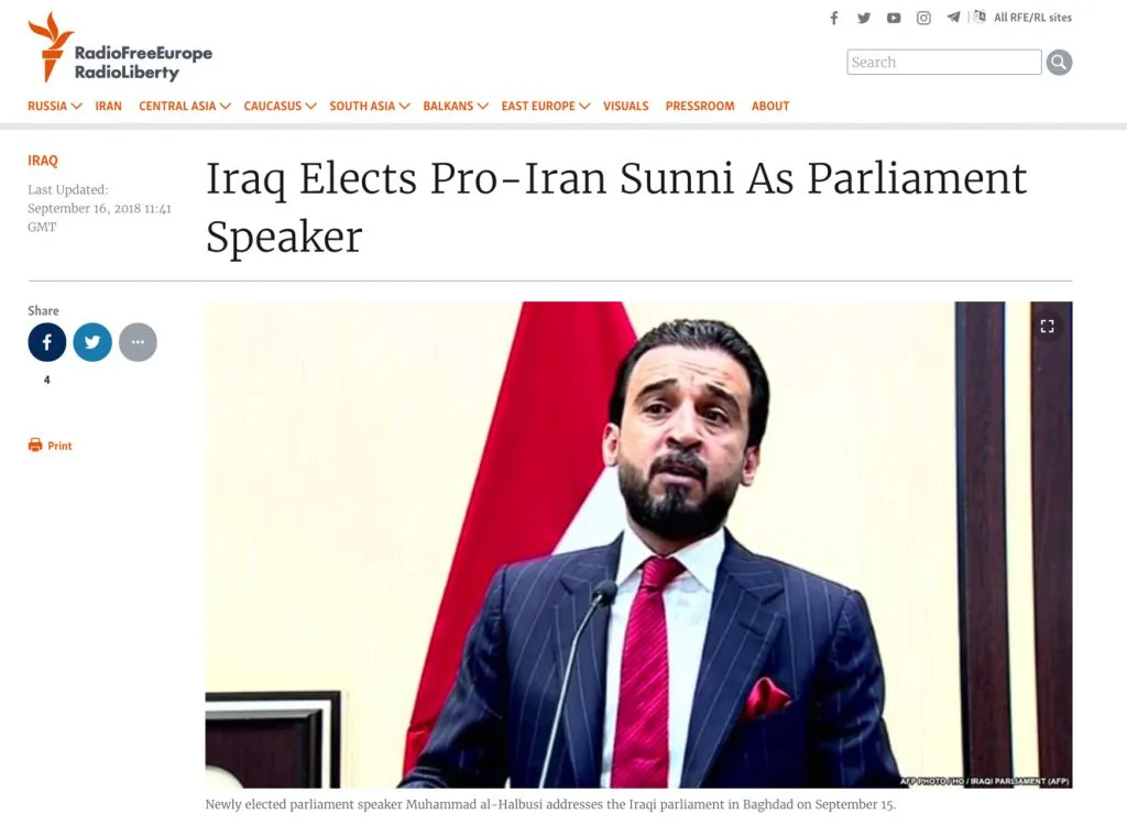 وفي تقرير للراديو بثه الأحد، إن الحلبوسي دعمته الكتلة الموالية لإيران (تحالف الفتح) بقيادة هادي العامري، وهو تحالف من المقاتلين شبه العسكريين ضمن الحشد الشعبي.
