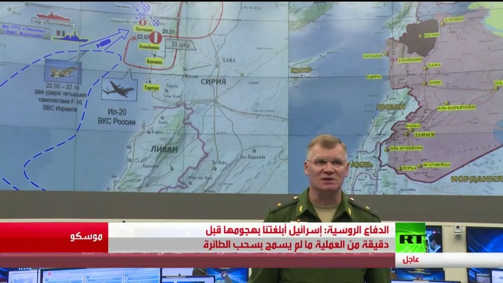 نشرت وزارة الدفاع الروسية، الثلاثاء، خارطة ما أسمته “الكمين الإسرائيلي”، يبين حركة الطائرات الإسرائيلية والروسية “إيل-20” قبل إسقاط الأخيرة.