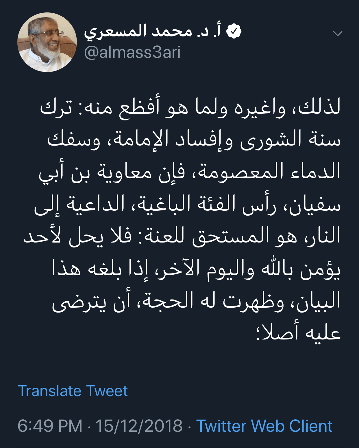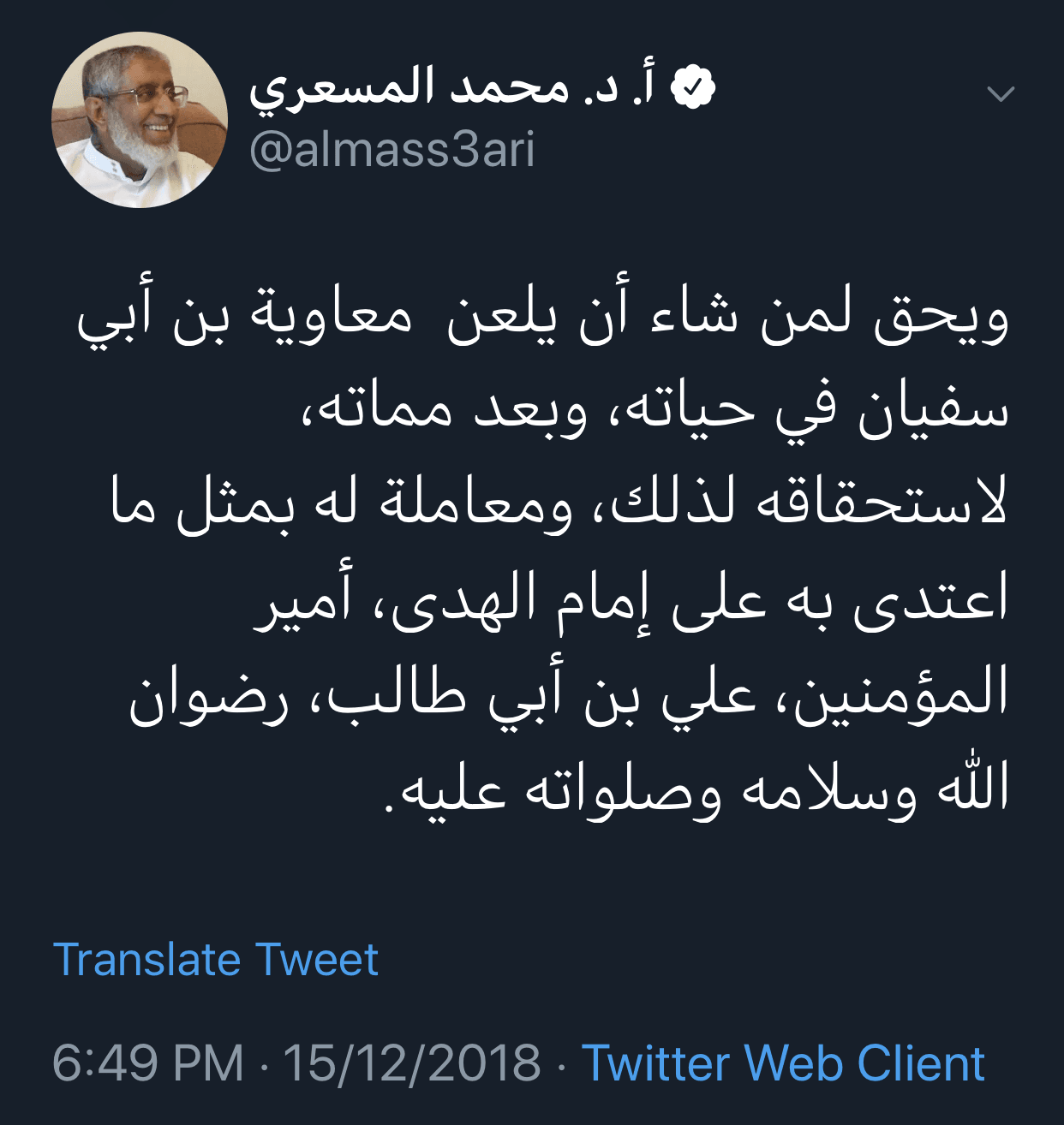 وهذه تغريدات للمسعري عبر موقع تويتر يفتي فيها بلعن الصحابي معاوية بن أبي سفيان