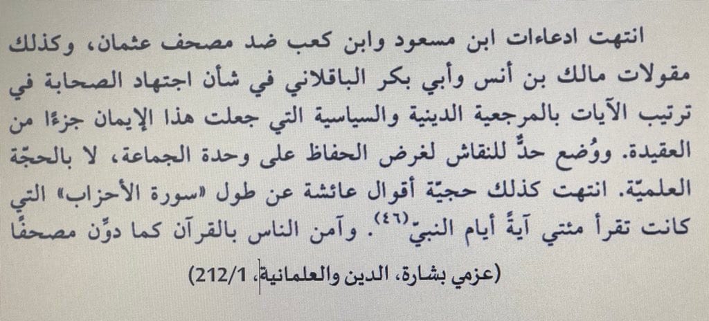 انتهت كذلك حجة عائشة عن طول “سورة الأحزاب”التى كانت تقرأ مئتى آية أيام النبى- صلى الله عليه وسلم،وآمن الناس بالقرآن ،كما دون مصحفاً. ويكمل فكرته بقوله:حتى لوتجاوزنا النقاش فى شأن العلاقة بين القرآن المحفوظ والمصحف المدون ،فإن الفرق بين القرآن والكتب المقدسة لبقية الديانات التوحيدية يتمثل فى أن الأخيرة كما يعتبرها المؤمنون أنفسهم مجموعة كتب لمؤلفين مختلفين منها مايحمل طابعا قدسيا وعظيا ومنها مايحمل طابعا قصصيا سرديا روائيا، وقد كتب فى حقب مختلفة وجمعت فى حقبة أخرى بنظر المؤمنين.