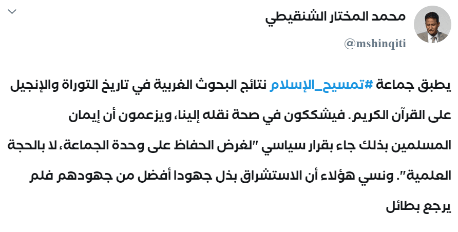 وقد رد عليه الدكتور الشنقيطى بقوله: “يطبق جماعة تمسيح الإسلام نتائج البحوث الغربية في تاريخ التوراة والإنجيل على القرآن الكريم. فيشككون في صحة نقله إلينا، ويزعمون أن إيمان المسلمين بذلك جاء بقرار سياسي “لغرض الحفاظ على وحدة الجماعة، لا بالحجة العلمية”. ونسي هؤلاء أن الاستشراق بذل جهودا أفضل من جهودهم فلم يرجع بطائل” انتهى.
