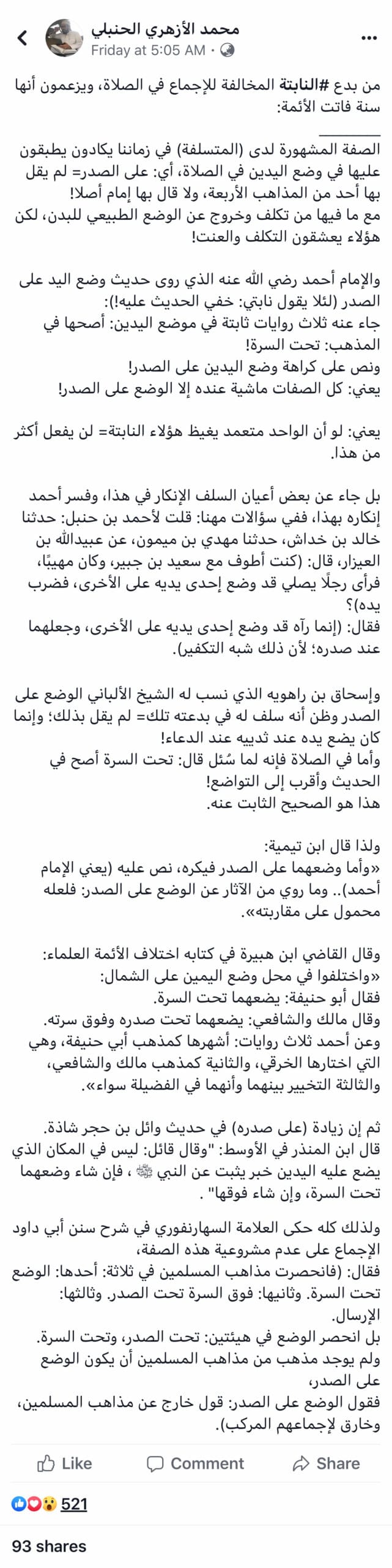 في يوم 13 ديسمبر 2019 نشر محمد عبد الواحد هذا المقال على موقع فيسبوك حول وضع اليدين في الصلاة وطبعا قبل أن يدخل في المسألة كعادته لا يستطيع أن يبدأ دون السب والتجريح في خصومه ولذلك لن نتوقف كثيرا عن هذه المقدمة لكن لو قارنتم لو قارنتم بين طريقة صاحب المقال الأصلي وهو الشيخ أحمد السويلم عضو هيئة التدريس بكلية الشريعة بالرياض، والذي لم يجرح أحد ولم يسب وطرح كلام العلماء في المسألة لبيان الحق والنصح للأمة، وبين طريقة مقال الأزهري الذي لا يستطيع أن يشرح مسألة علمية إلا بشتم خصومه والتشنيع عليهم!