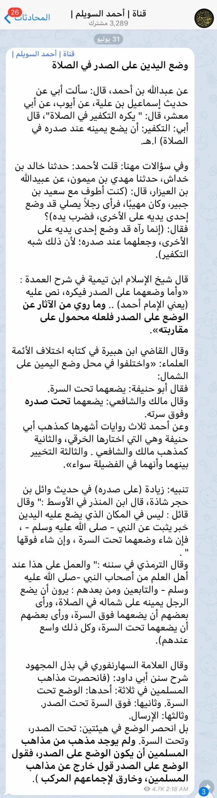 بتاريخ 31 يوليو 2019 نشر الشيخ أحمد السويلم في قناته على تليجرام مقالا بعنوان (وضع اليدين على الصدر في الصلاة) ونقل فيه بعض أقوال العلماء حول هذه المسألة.