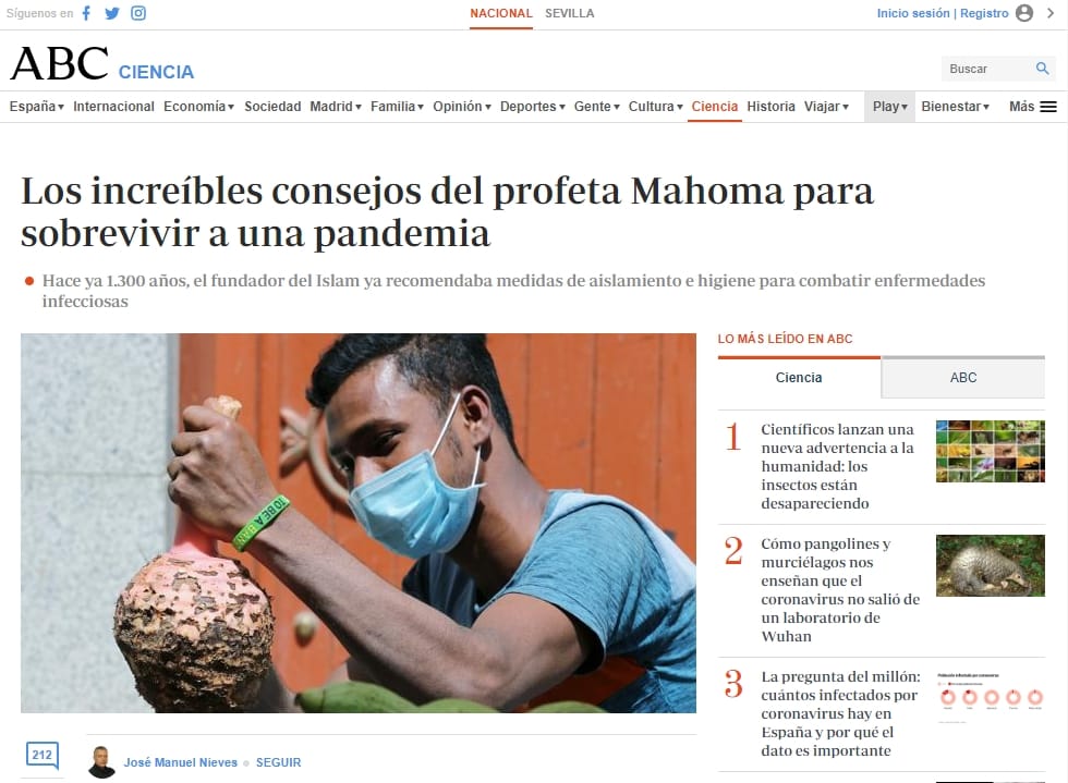 نشر موقع صحيفة “ABC” الإسبانية تقريرا ألقى فيه الضوء على “نصائح النبي ﷺ المذهلة” في مواجهة الأوبئة، والمنطبقة على الإجراءات التي ينصح بها اليوم للحد من تفشي فيروس كورونا المستجد.