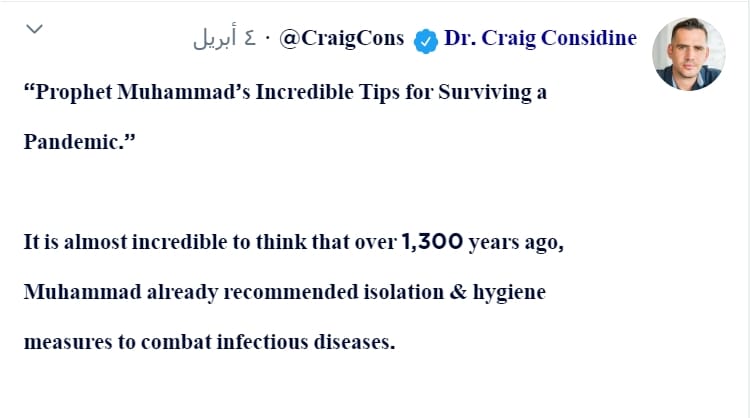 واعتبر الكاتب الإسباني “خوسه مانويل نيفز” أنه من المذهل أن النبي محمد ﷺ، الذي عاش قبل أكثر من 1300 عام، والذي كان أميا ولا يتمتع بأي تدريب علمي، بحسبه، “كان يعرف بالفعل، خطوة بخطوة، ما يجب فعله أثناء الوباء”.