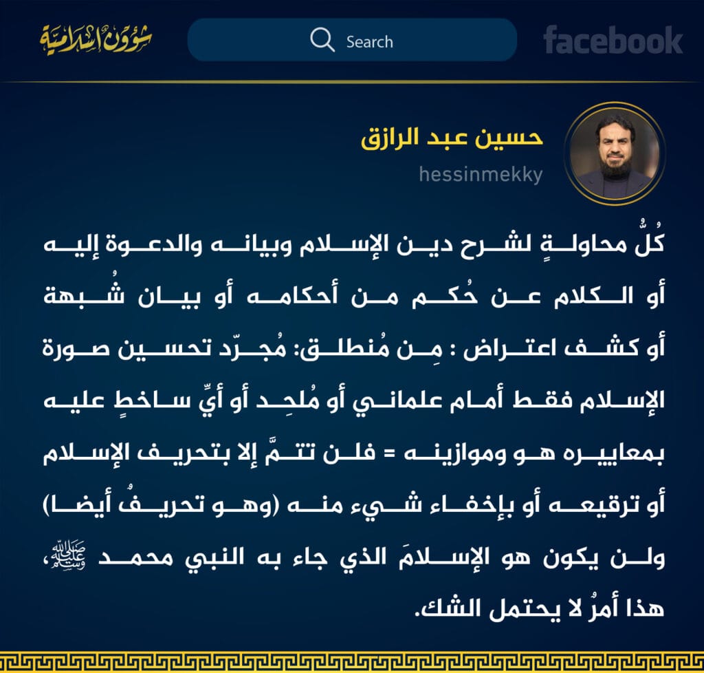 كُلُّ محاولةٍ لشرح دين الإسلام وبيانه والدعوة إليه أو الكلام عن حُكم من أحكامه أو بيان شُبهة أو كشف اعتراض : مِن مُنطلق:مُجرّد تحسين صورة الإسلام فقط أمام علماني أو مُلحِد أو أيِّ ساخطٍ عليه بمعاييره هو وموازينه = فلن تتمَّ إلا بتحريف الإسلام أو ترقيعه أو بإخفاء شيء منه (وهو تحريفٌ أيضا) ولن يكون هو الإسلامَ الذي جاء به النبي محمد صلى الله عليه وسلم، هذا أمرٌ لا يحتمل الشك