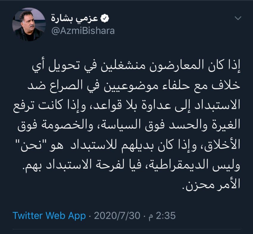 بعد أن وصفه أحد المذيعين العرب في تركيا أنه حاقد على الإسلام (والحمد لله على بداية ظهور الوعي بخطر هذا الأخطبوط)، أعلن عزمي أنطون بشارة مظلمته على تويتر البارحة، قائلا: لا تعادوني لأننا في خندق واحد ضد الاستبداد، ولا تحسدوني رجاءً!