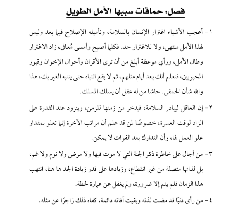 ٣- من أجال على خاطرة ذكر الجنة التي لا موت فيها ولا مرض ولا نوم ولا غم، بل لذاتها متصلة من غير انقطاع، وزيادها على قدر زيادة الجد ها هنا، انتهب هذا الزمان فلم ينم إلا ضرورة، ولم يغفل عن عمارة لحظة.