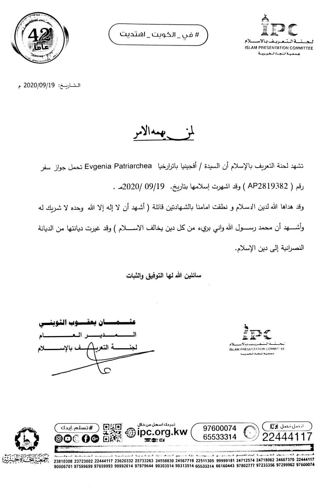 من مهتديات لجنة التعريف بالإسلام توفيت الأخت اليونانية (أفجينيا باترارخيا) ودفنت عصر اليوم في الصليبيخات بالكويت