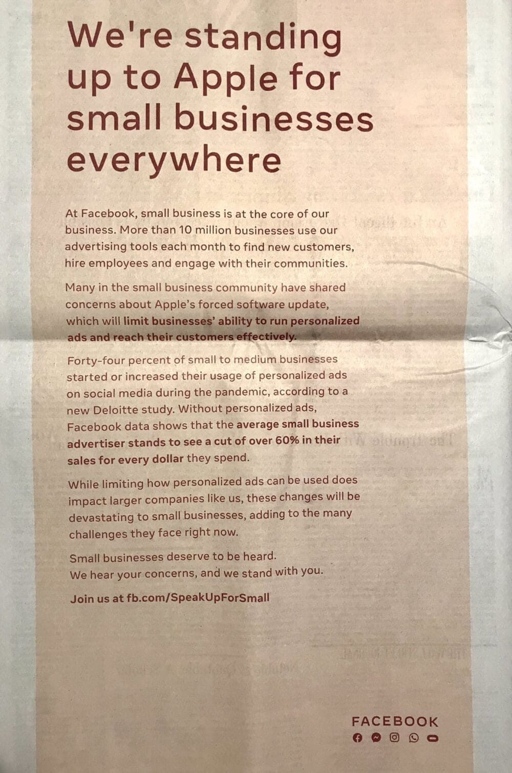 وهو ما اعتبرته شركة فيسبوك، في بيان نشرته عبر مدونتها، إجراءا يعوق سياسة الإعلانات واستهداف الجمهور لديها، وبالتالي التأثير على المشروعات الصغيرة التي تعتمد على إعلانات المنصة في مجال عملها.