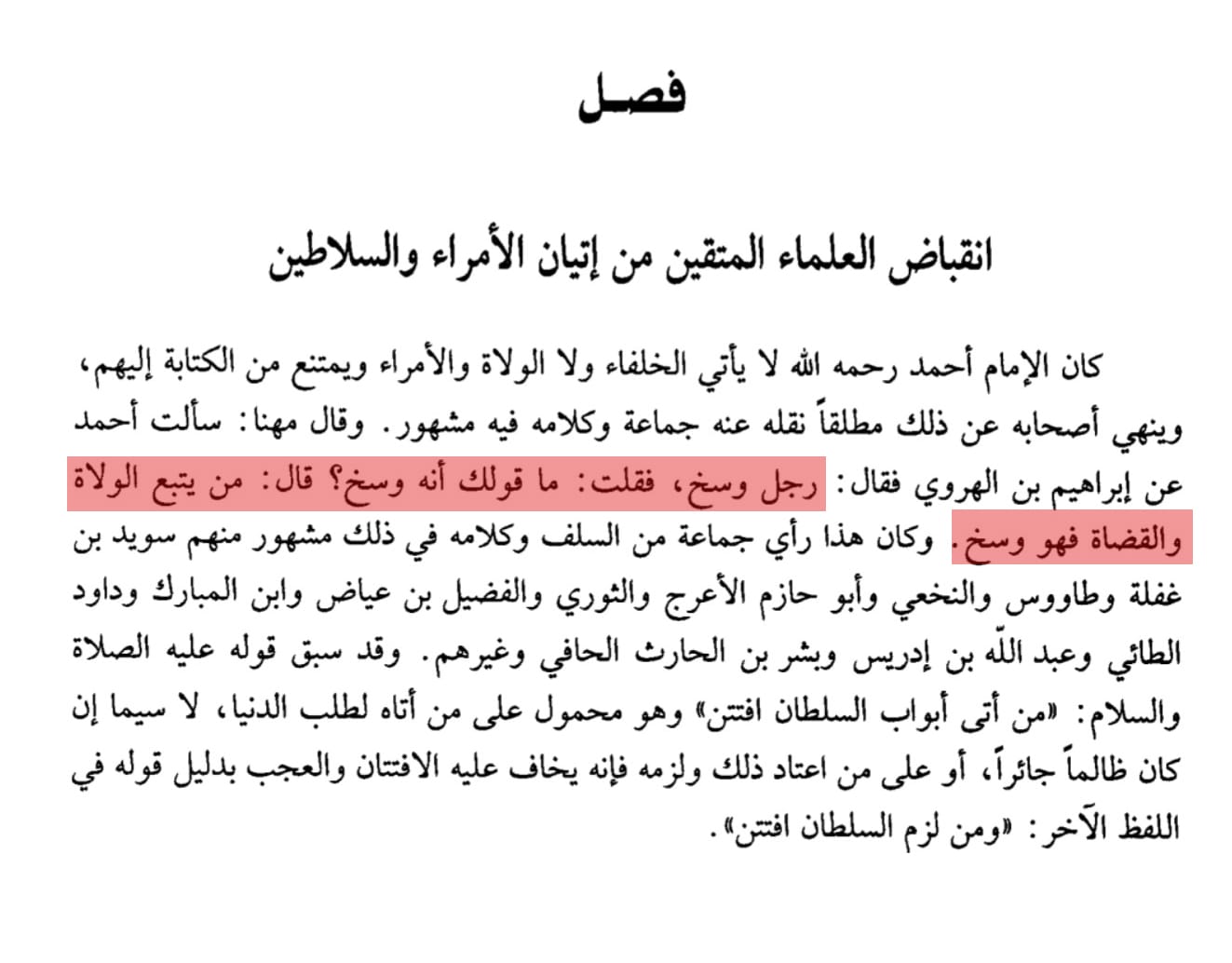 وكان هذا رأي جماعة من السلف ، وكلامه في ذلك مشهور منهم سويد بن غفلة وطاوس والنخعي وأبو حازم الأعرج والثوري والفضيل بن عياض وابن المبارك وداود الطائي وعبد الله بن إدريس وبشر بن الحارث الحافي وغيرهم . وقد سبق قوله عليه الصلاة والسلام {من أتى أبواب السلطان افتتن} وهو محمول على من أتاه لطلب الدنيا ، لا سيما إن كان ظالما جائرا ، أو على من اعتاد ذلك ولزمه فإنه يخاف عليه الافتتان والعجب بدليل قوله في اللفظ الآخر { ومن لزم السلطان افتتن } ..