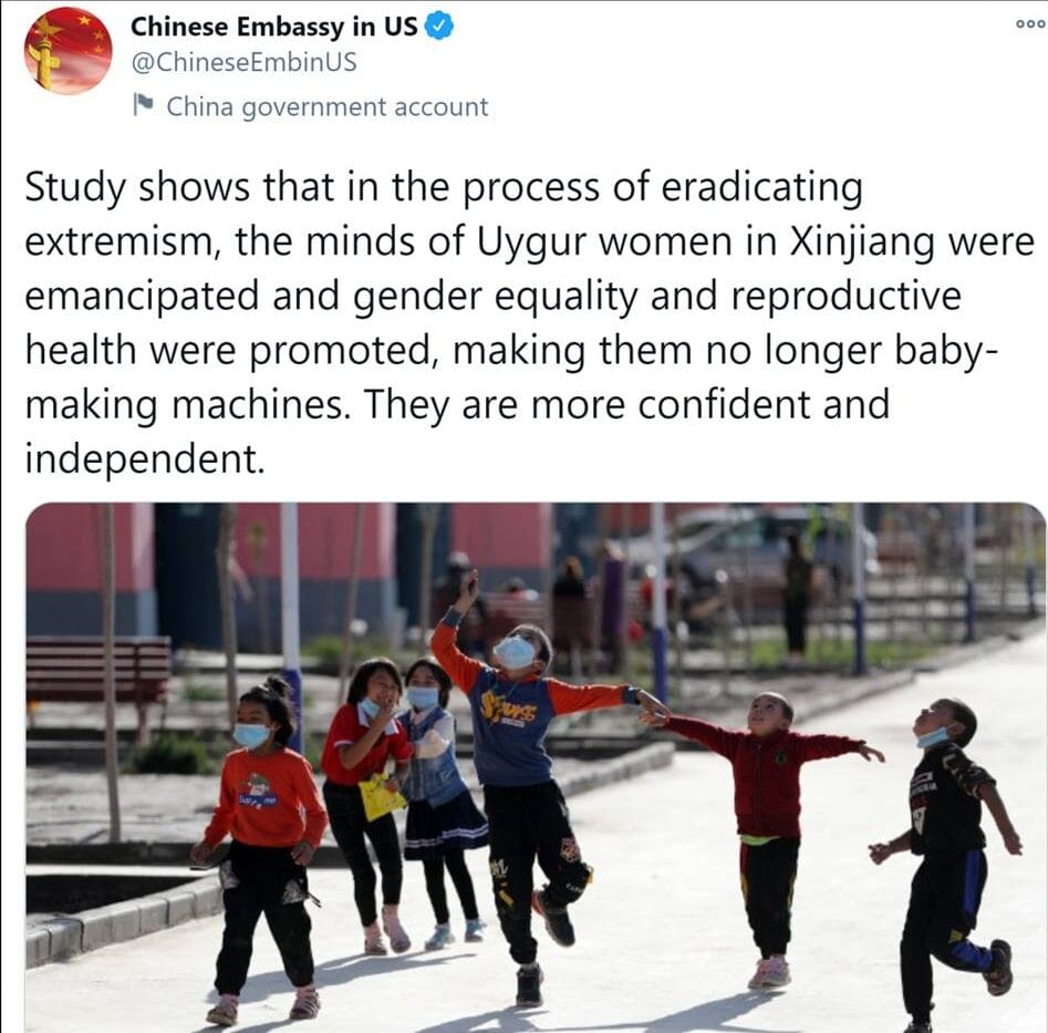 عن ماذا تتكلم التغريدة في الواقع؟ عما تقوم به الصين من احتجاز الرجال المسلمين في إقليم تركستان في معتقلات ضخمة مليونية يُمنعون فيها من ممارسة أية شعائر دينية ويجبرون على إظهار القناعة بالشيوعية، وأخذ الأطفال من أحضان أمهاتهم ليوضعوا في معتقلات أخرى لينشؤوا على الشيوعية، وإحداث العقم القسري في النساء المسلمات..تقول جريدة تابعة للحكومة الصينية أن هذا حقق الثقة بالنفس والحرية والاستقلالية لدى المراة المسلمة الصينية…ما أروعك أيتها الصين !!!