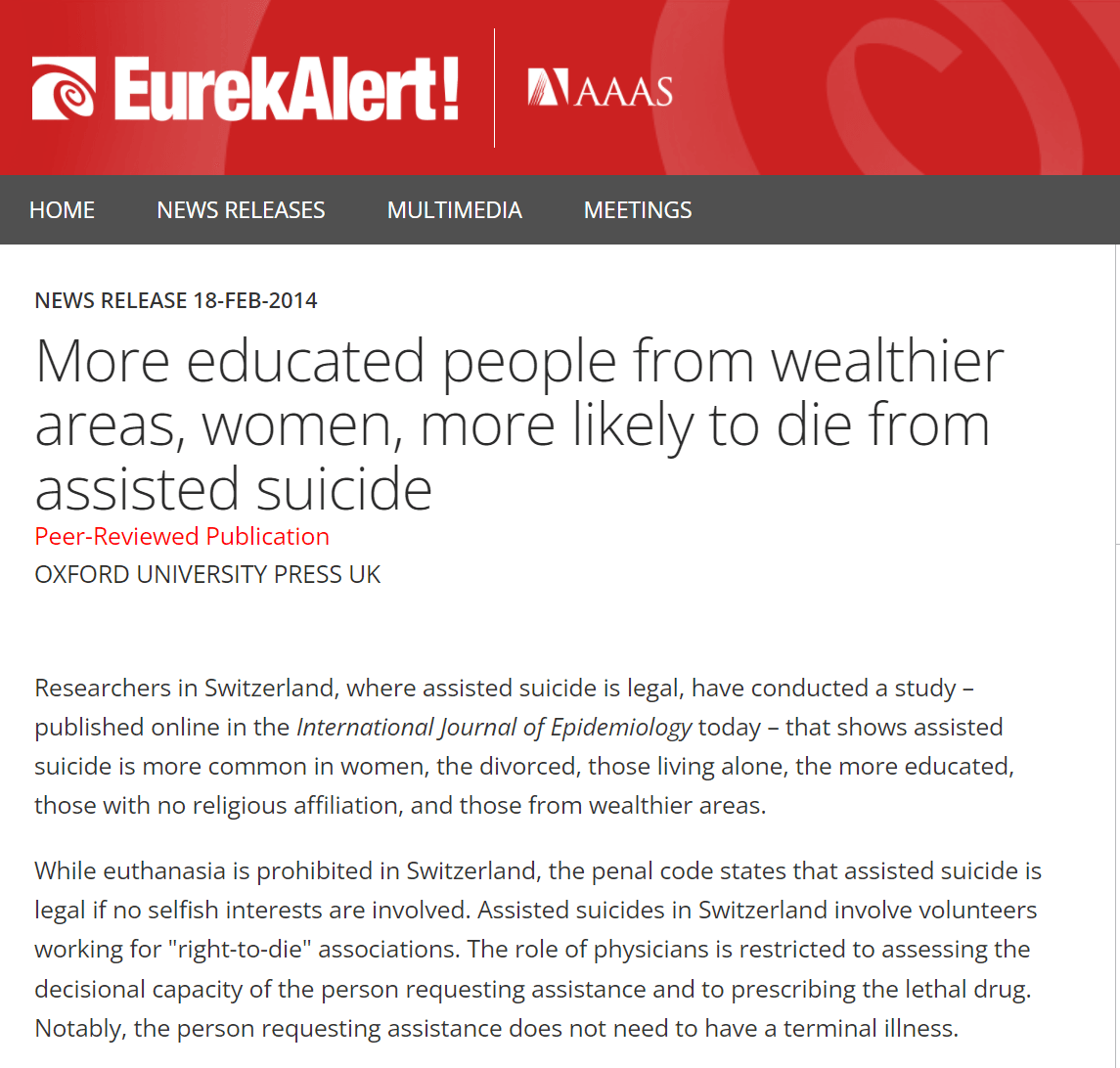 ووفقًا لدراسة أجراها موقع eurekalert للعلوم والأبحاث فإن غالبية الأشخاص الذين يزورون عيادات الانتحار في سويسرا هم الملاحدة والأثرياء وأصحاب الدرجات العلمية العالية والنساء المطلقات والأشخاص الذين يعيشون بمفردهم!