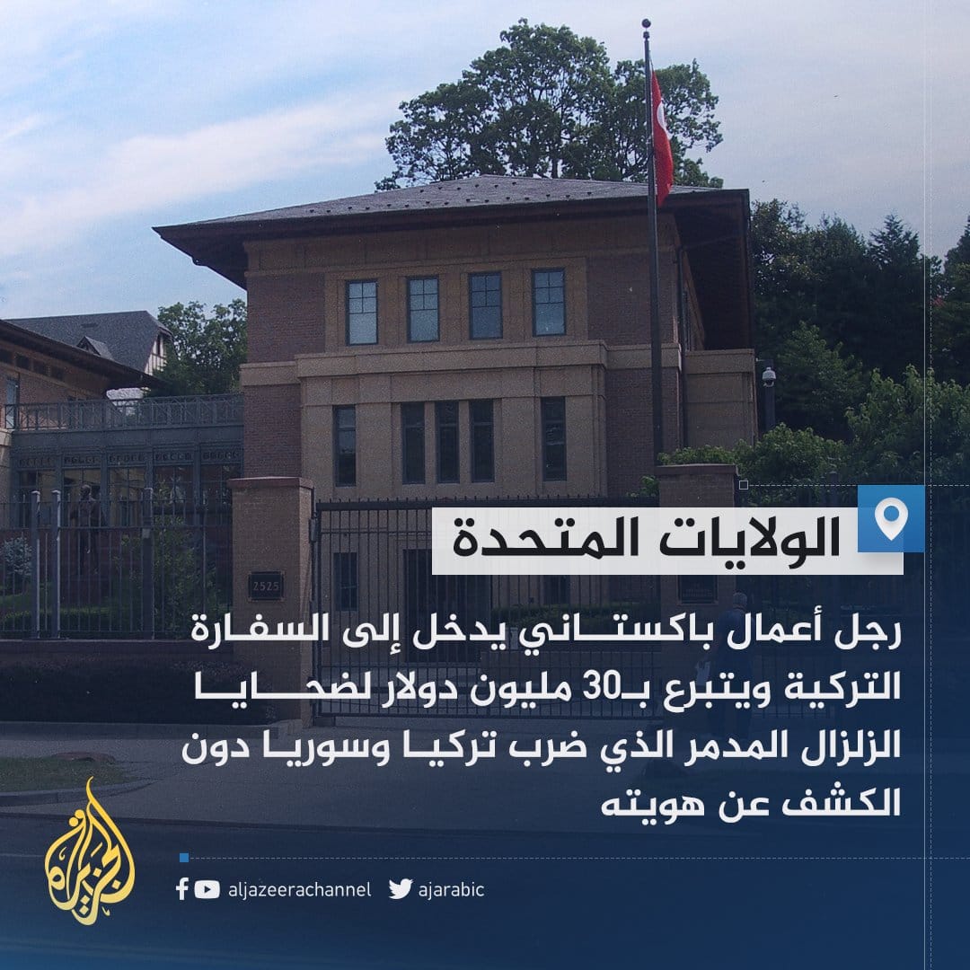 وفقًا لما نقلته قناة الجزيرة فإن رجل أعمال باكستاني دخل إلى السفارة التركية في الولايات المتحدة الأمريكية وتبرع بمبلغ 30 مليون دولار لضحايا الزلزال المدمر الذي ضرب تركيا وسوريا دون الكشف عن هويته.