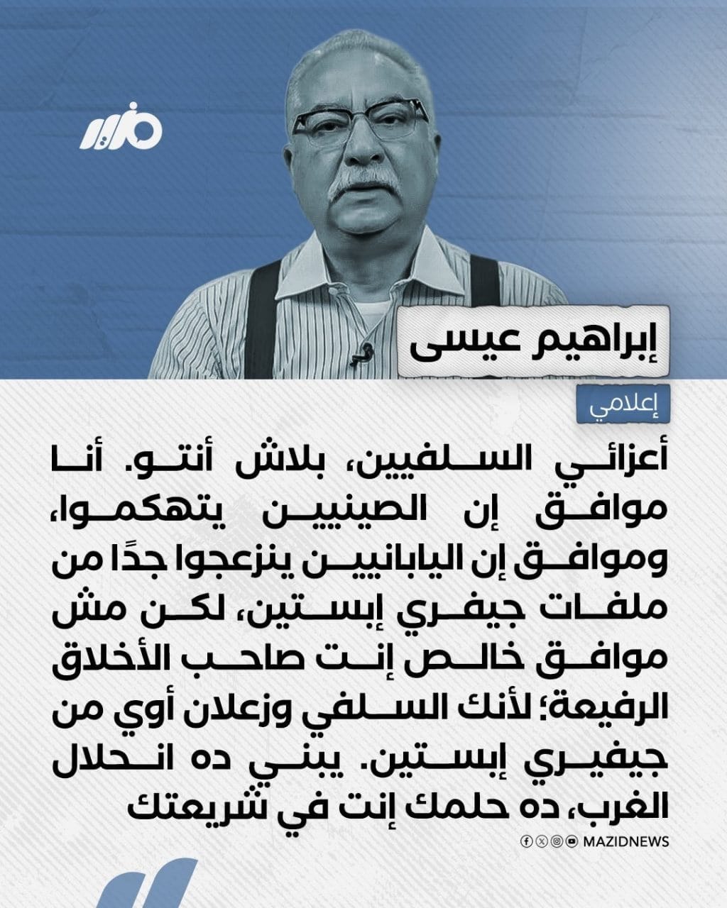 لكن الذي حصل هو العكس تماماً: خرج علينا إبراهيم عيسى بعد هذه الفضيحة العالمية لا ليحاكم المنظومة التي أنتجت إبستين، بل ليهاجم الشريعة الإسلامية!