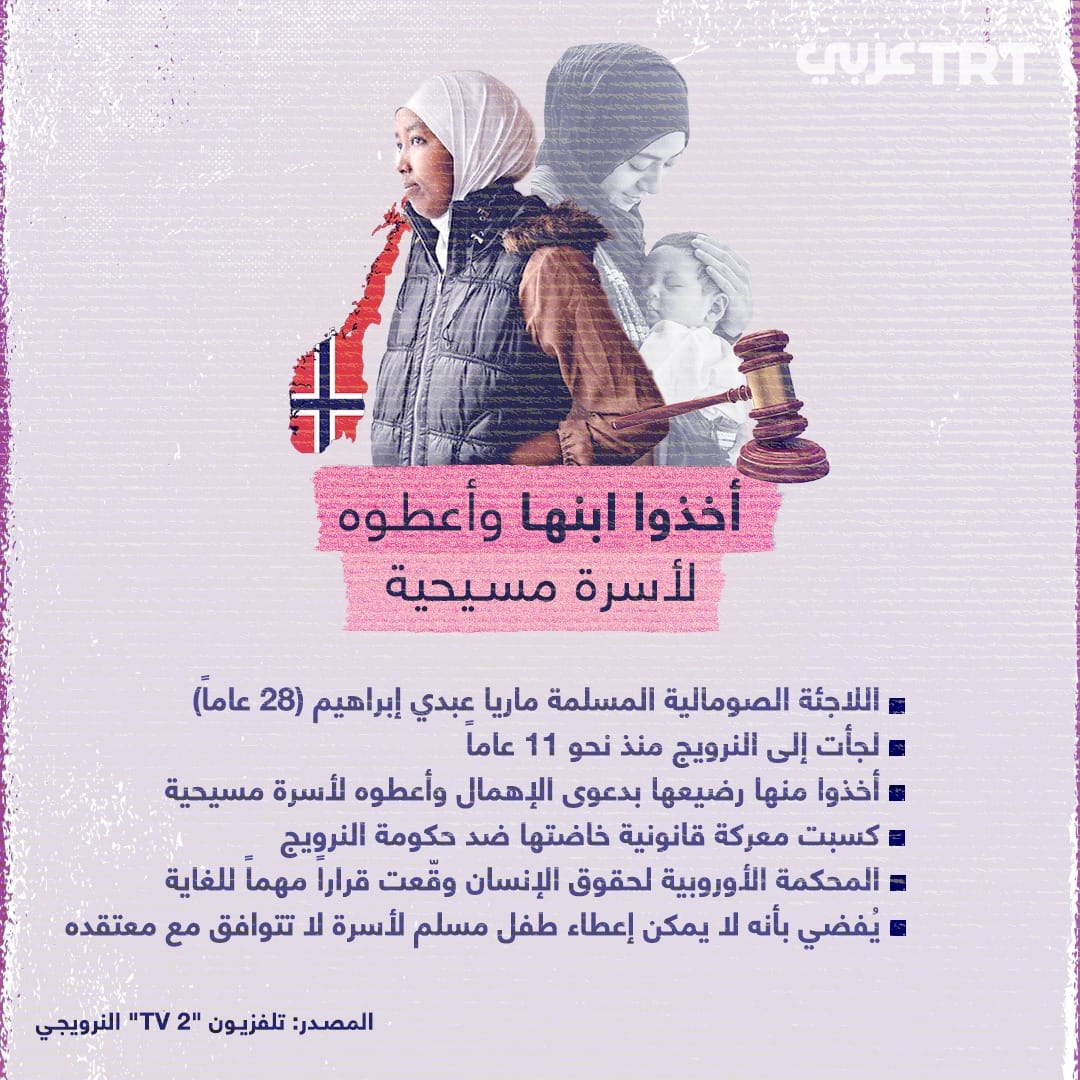 أولا: الخبر كما نشر في تي آر تي عربي كالتالي: انتصار سيحقق شعوراً جيداً لدى #المسلمين في أوروبا.. اللاجئة الصومالية المسلمة ماريا عبدي إبراهيم كسبت معركة قانونية خاضتها ضد حكومة #النرويج بعد أخذ رضيعها منها وإعطائه لعائلة مسيحية.