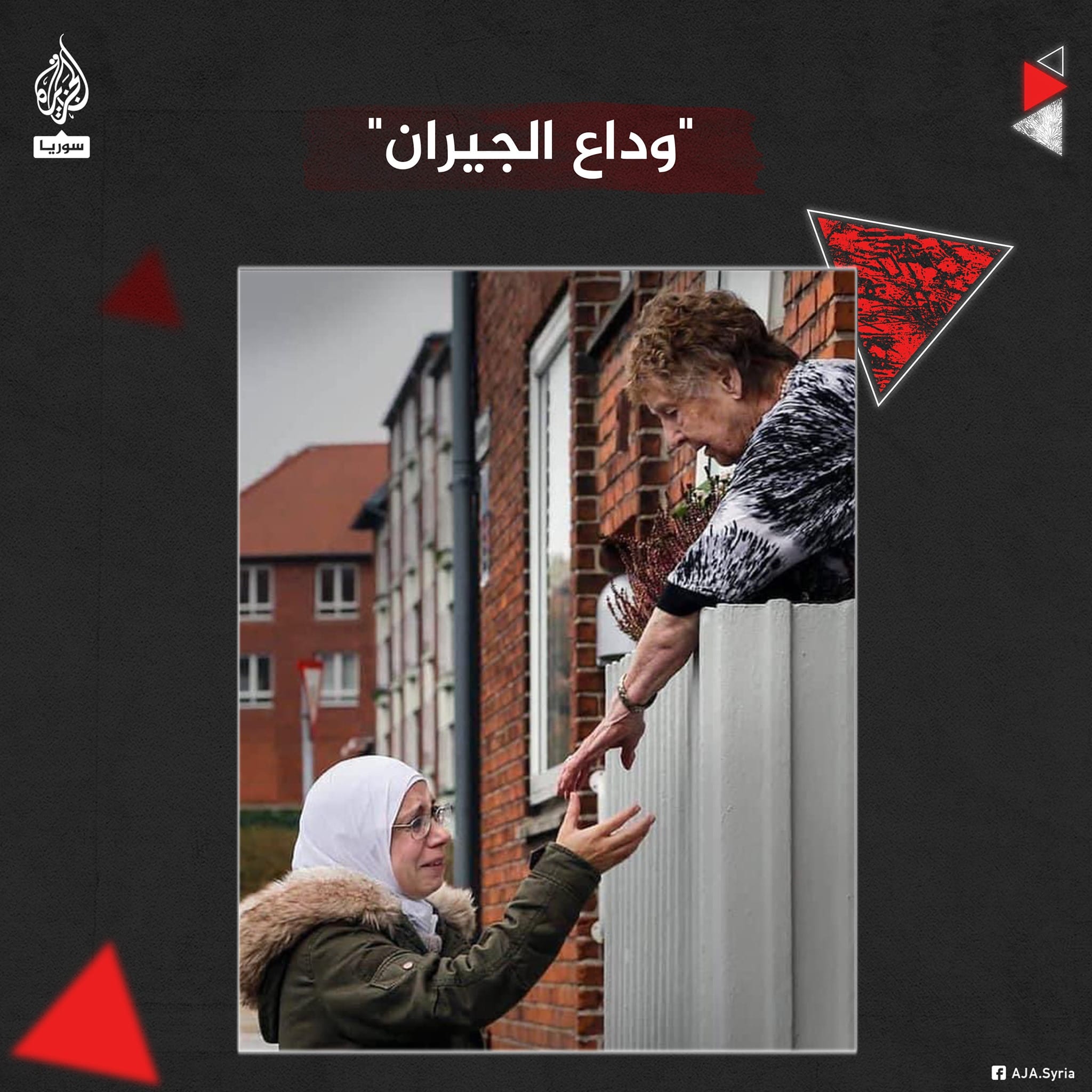 مسنة دنماركية تودّع جارتها اللاجئة السورية أسماء الناطور في مدينة رينجستيد، قبل نقلها مع زوجها إلى مخيمات الترحيل، في إطار إجراءات #الدنمارك لإعادة اللاجئين المنحدرين من #دمشق بدعوى أنها أصبحت “آمنة”.